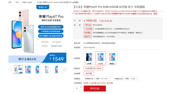 经过多日等待,荣耀Play6T Pro将于今日上午10:08迎来首销,8GB+256GB版本售价1599元,至于荣耀Play6T,官方表示,预计会在4月下旬开售。