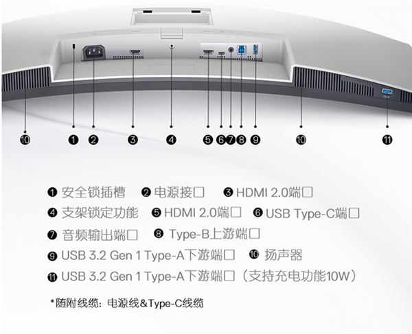 接口方面,S3423DWC配备了两个HDMI 2.0接口、一个USB Type-C接口、三个USB 3.0。USB Type-C接口可进行数据传输、视频传输和65W的外接供电。