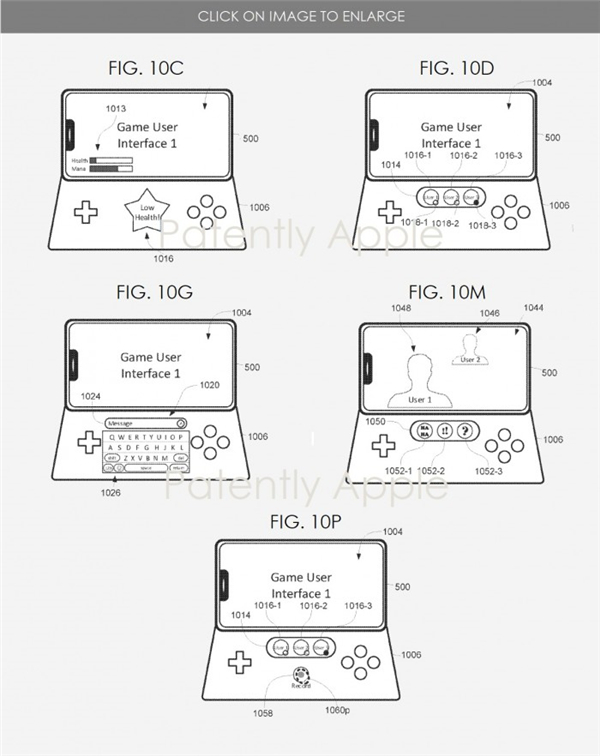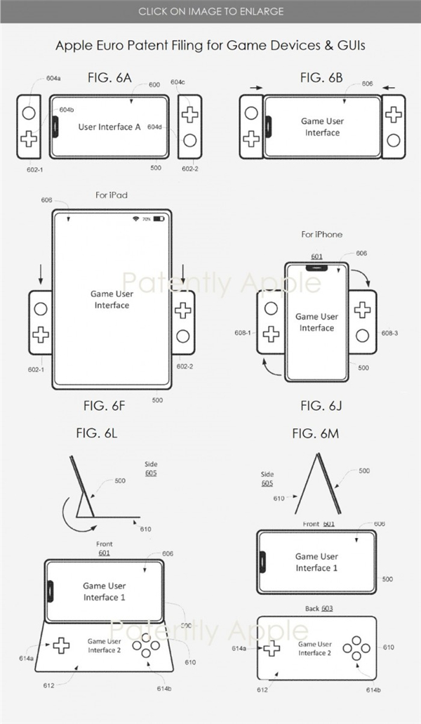 据说目前苹果正在测试三种不同样式的游戏手柄,且 FIG 6A、6B、6F、6J 等配件可毫不费力地附加连接到 iPhone 上,让后者轻松变身为一款便携式游戏设备。