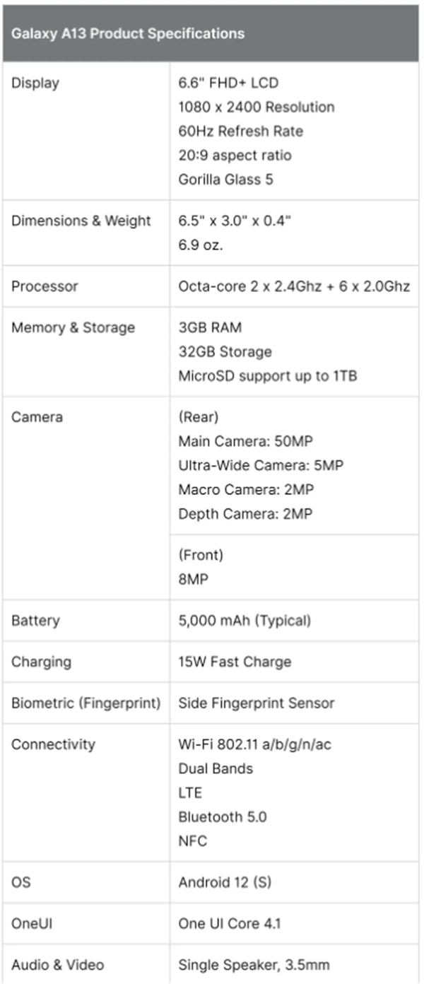三星 Galaxy A13 近日在美国上市发售。这是一款并不支持 5G 网络的入门机型,零售价格为 189 美元。三星表示该机是医疗保健、零售和物流等行业的理想选择,因为它有足够的能力填写表格、记录数据、用地理标签签到,有持久的电池,还有一个可以扫描条形码和拍摄高清晰度照片的多镜头摄像系统。