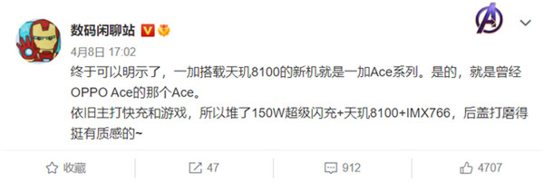 据微博博主 @数码闲聊站 称,一加搭载天玑 8100 的新机就是一加 Ace 系列。是的,就是曾经 OPPO Ace 的那个 Ace。依旧主打快充和游戏,支持 150W 超级闪充 + 天玑 8100+IMX766,后盖打磨得挺有质感。