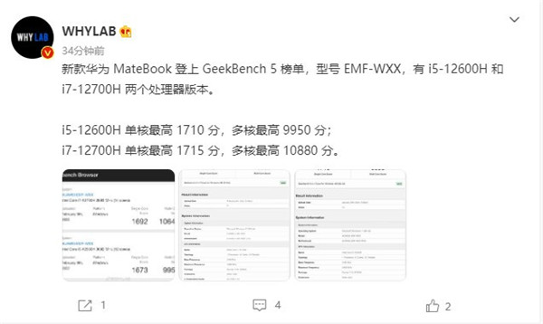 今日,数码博主@WHYLAB爆料,新款华为MateBook登上GeekBench 5榜单,型号EMF-WXX,有i5-12600H和i7-12700H两个处理器版本。