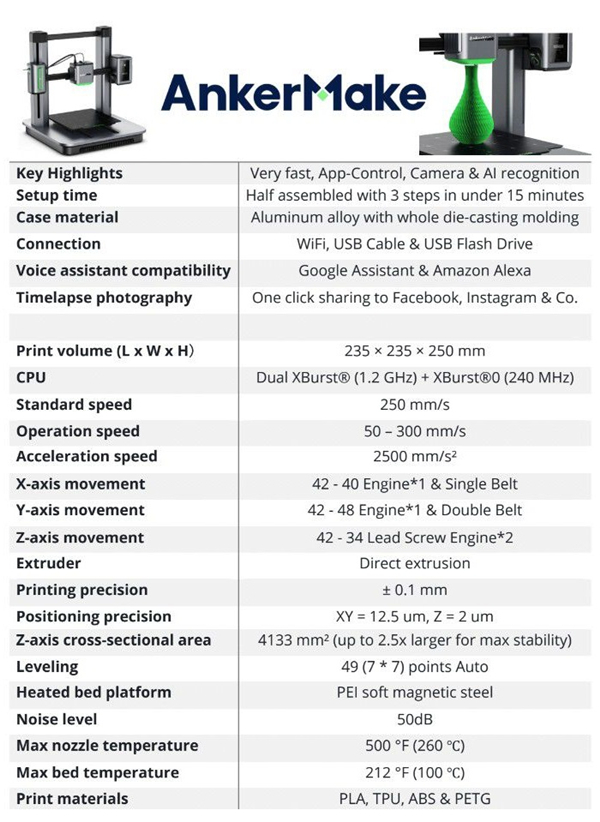 速度方面,AnkerMake M5 宣称是竞品的五倍。只需在包装箱中取出打印机的连个部分、用螺丝连接到一起、插入两条 USB-C 数据线和一个电源适配器,便能够以 250 mm/s 速度打印。