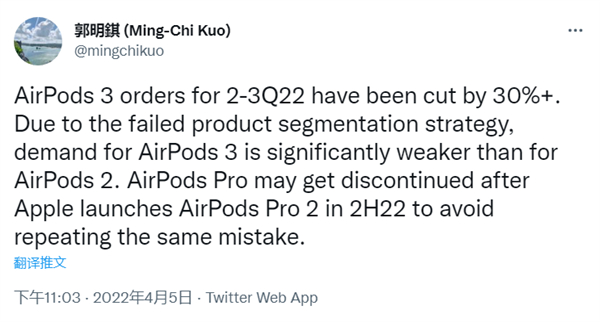 此外,郭明錤表示,由于人们对第三代AirPods需求减弱,导致这款耳机订单至少削减30%,而旧款AirPods Pro也将会在新款产品发布时停产。