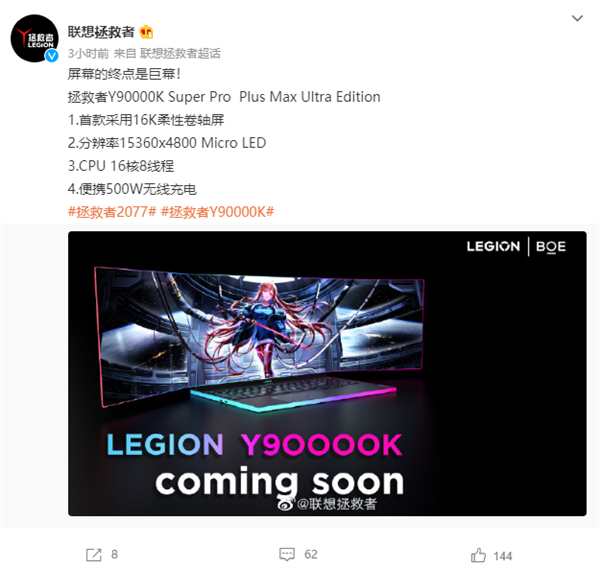 这样一款配置夸张的笔记本电脑,有着一个更为夸张的名字:拯救者Y90000K Super Pro Plus Max Ultra Edition,这一长串后缀可以说是戏剧性拉满了。