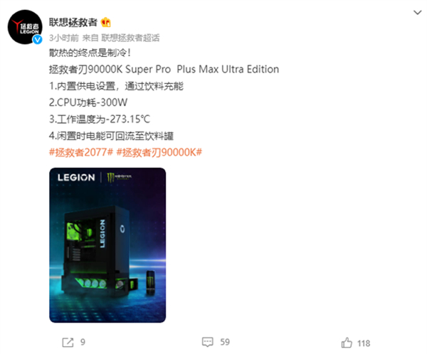 值得一提的是,除了这款Y90000K笔记本外,联想还“发布”了一款刃90000K主机,并宣称工作温度为-273.15℃,即热力学上的绝对零度。
