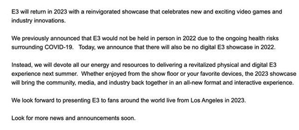 组织 E3 电子娱乐展的机构电子软件协会 (ESA) 今日发送电子邮件通知游戏行业的顶级营销代表,宣布它已取消 E3 2022 的举办。虽然官方没有解释此次展会取消的细节,但策划者希望“重新整合,并在 2023 年以更大规模的盛会重新再来”。