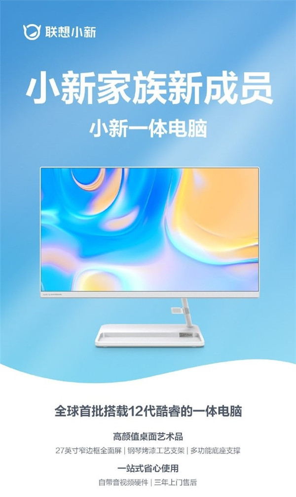 据悉,联想小新将迎来新成员,它就是全球首批搭载12代酷睿处理器的一体电脑,整机采用十分简洁的外观设计,号称高颜值桌面艺术品。同时搭载一块27英寸窄边框全面屏,烤漆工艺支架从右侧引出,虽然不对称,但看起来十分协调。同时它的多功能底座具备凹槽,可以放置零散物品,可能支持无线充电功能。