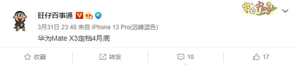 数码博主 @旺仔百事通 透露,华为 Mate X3 将于 4 月底发布,但目前官方尚未开始预热或官宣。