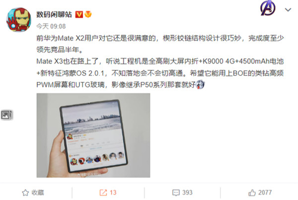 还有其他消息称,华为 Mate X3 折叠屏“外折”回归,并且采用右侧打孔设计。
