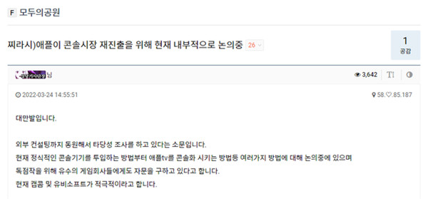 在 Clien 论坛上有爆料者声称,中国台湾供应链中传出消息称苹果考虑重返游戏行业。有传言说,苹果正在借助外部咨询管理有关人员进行可行性研究。