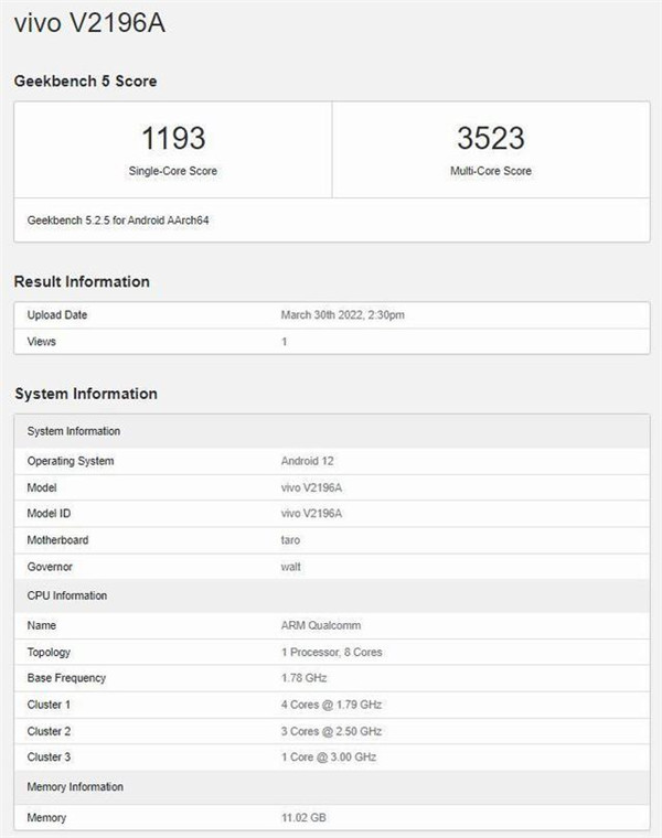 现在该机已经出现在了基准测试平台 Geekbench 上,证实该机搭载了高通骁龙 8 Gen1 芯片代号为“Taro”。iQOO Neo 6 还配备了 12 GB RAM,预装 Android 12 系统,单多核分别为 1193 分、3523 分。