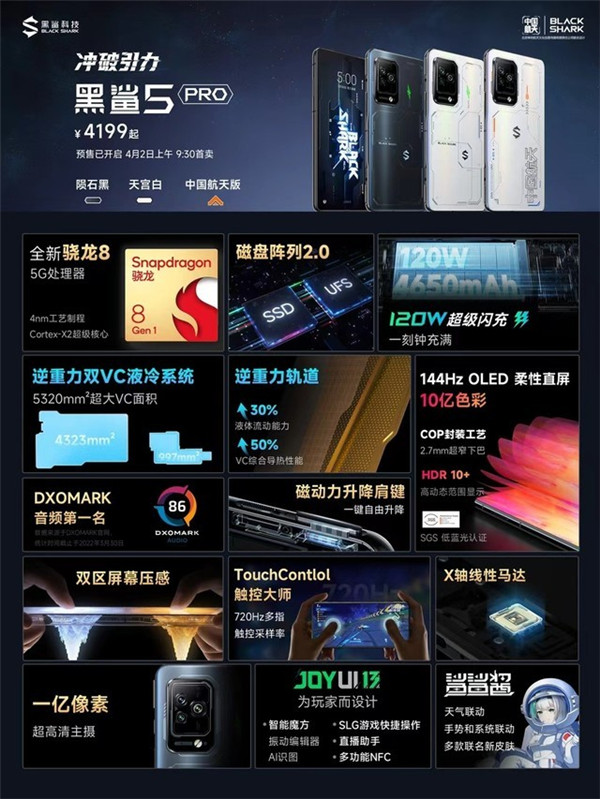 黑鲨5系列手机正式发布,包含黑鲨5 Pro、黑鲨5 RS、黑鲨5三款。黑鲨5 Pro搭载骁龙8 Gen 1,起售价4199元。黑鲨5 RS搭载骁龙888/888+,起售价3299元。黑鲨5搭载骁龙870,起售价2799元,航天版12+256售价3499元,新品已经开启预售。