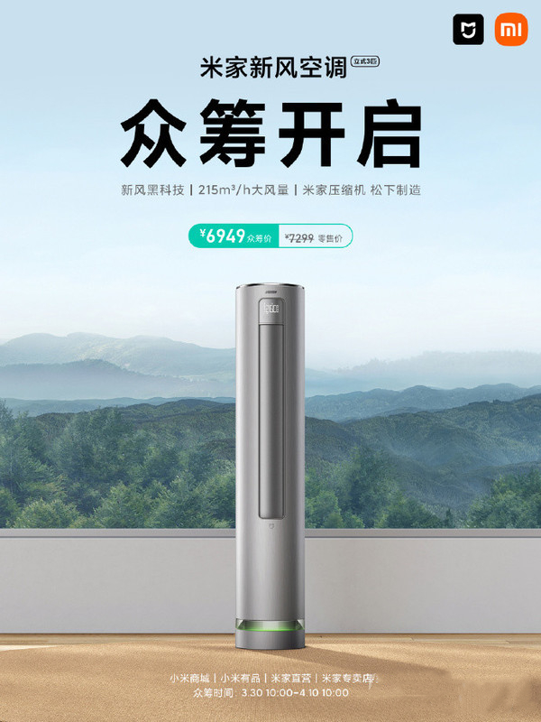 3月30日,米家新风空调立式3匹正式开启众筹,众筹到手价6949元。根据官方介绍,该空调采用新风黑科技、升级215m3/h大新风量,搭载米家压缩机,由松下制造,高效节能,购买可享10年质保。