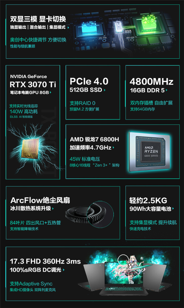 处理器依然是锐龙7 6800H,显卡可选RTX 3060、RTX 3070 Ti,都是140W满功耗释放,冰川散热系统也升级到双风扇四出风口五热管。