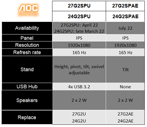 最后,AOC GAMING 24G2SPU / 27G2SPU 将于 2022 年 3/4 月开始出货,建议零售价分别为 263.80 / 324.47 美元。24G2SPAE / 27G2SPAE 则是 7 月上市,售价为 237.42 / 296.77 美元。