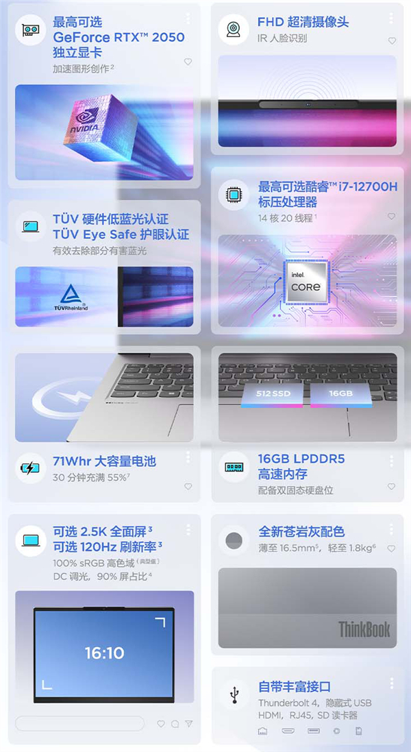 ThinkBook 16+A面采用极具辨识度的撞色设计,薄至16.5mm,随手便可放入背包之中。️屏幕为16:10比例、2.5K高分辨率、120Hz高刷新率、90%超高屏占比。