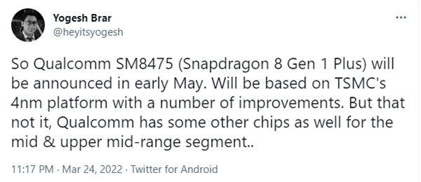 据消息人士 Yogesh Brar 爆料,高通公司将在 2022 年 5 月初发布骁龙 8 Gen 1+(型号为 SM8475)。这款即将推出的高端芯片组将基于台积电的 4 纳米半导体制造工艺,经测试,该工艺比三星代工的 4 纳米工艺更高效。
