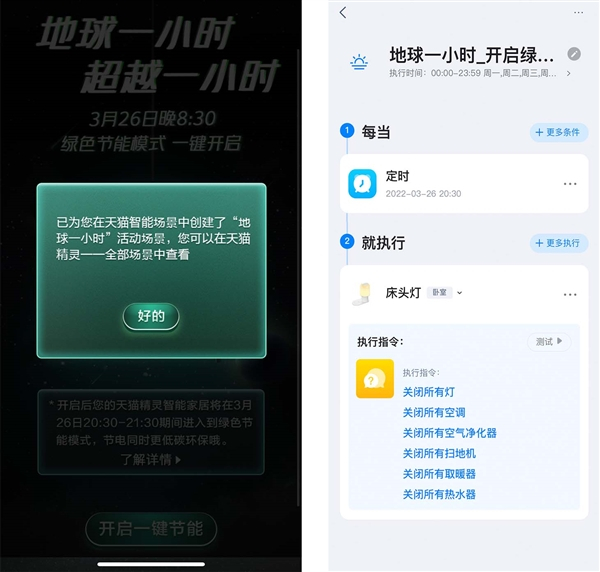 “为了引导普通人形成节能减排的意识,降低‘地球一小时’活动的参与门槛,我们借助物联网的场景联动模式,主动向生态内的用户推送‘一键节能’快捷场景,消费者只需点击授权同意开启,家里的灯、空调、电暖器等设备就会在3月26日20:30至21:30期间自动进入待机或关闭状态。”