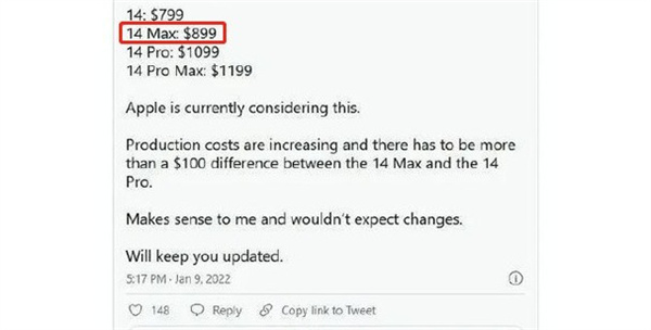 其中美元的售价已经曝出,相比6.1寸的iPhone 14.iPhone 14 Max只高了100美元,899起售价折合人民币5700元左右,iPhone 14 Max国内的起售价可能定在6999元,而iPhone 14起售价非常有可能和iPhone 13保持一致,在5999元。