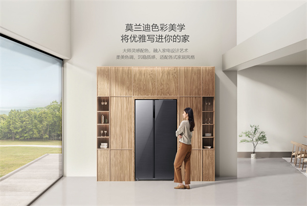 从商品信息来看,这款冰箱采用莫兰迪色彩美学,融入大师灵感配色,适配各式家居风格,整体采用通透冰晶玻璃,兼具美观与实用性,防油烟、易清洁、防刮擦,内部采用“轻奢金属材质”,支持 360 度风冷循环;90° 门体可悬停、90° 开门抽展即可拉出。