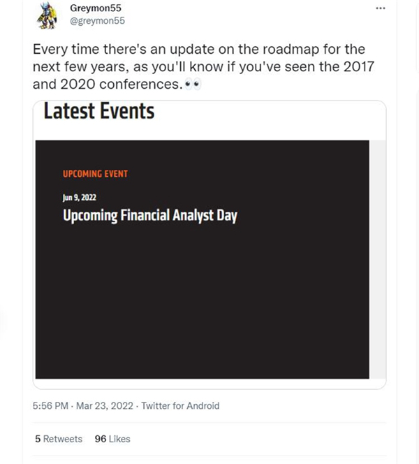 今天有用户爆料称,AMD将会在6月9日举办财报分析师大会,届时AMD将会在本次分析师大会上公布AMD未来的计划,比如说在Zen 4之后会朝着怎样的路线图前进,推出Zen 5、Zen 6这样的处理器,而在图形领域则是RDNA 3架构之后的架构,比如说RDNA 4等,这主要的原因就是让这些证券分析师们了解到AMD之后的发展方向,以更好地评估它的发展实力。