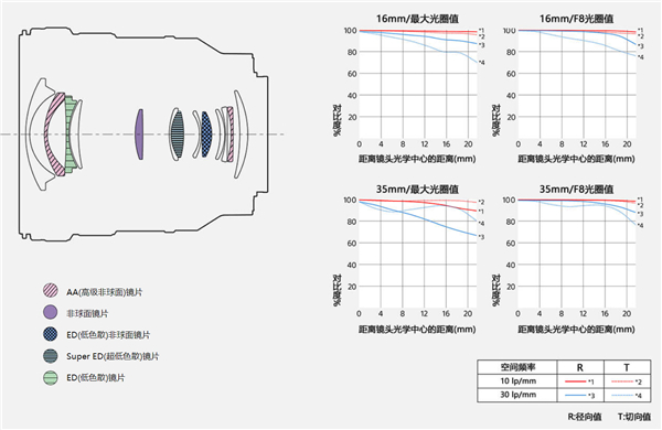 FE PZ 16-35mm F4 G是一支小巧超广变焦镜头,成像圈可以覆盖全画幅,大小只有Φ80.5mm x 88.1mm,使用72mm滤镜,重量为353g,由于采用电动内变焦设计,变焦时镜头不会伸长。在镜头内部采用12组13片光学结构,其中包含了2片高级非球面镜片(AA)、1片非球面镜片、一片 SuperED(超低色散)、一片ED(低色散)玻璃镜片以及1片ED(低色散)非球面镜片,前端镜片使用了氟镀膜,同时搭载了6个XD线性马达,其中两个马达用于AF,4个马达用于变焦,兼容A1 30FPS高速连拍。镜头广角端、广角端最近对焦距离为0.28米、0.24米,最大放大倍率约0.23倍。