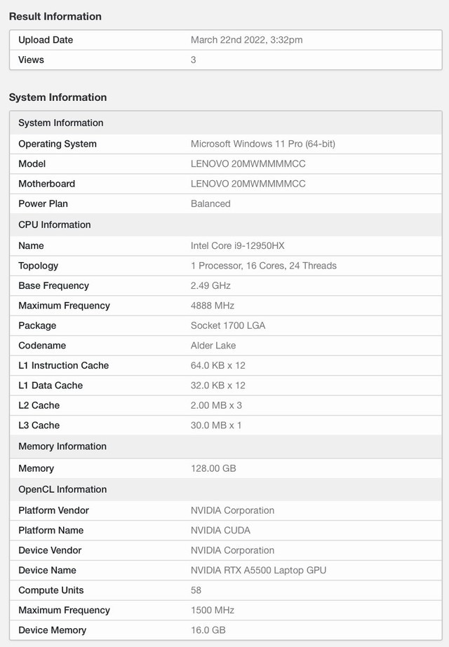 今日晚间消息,benchleaks消息称,Geekbench最新出现了一款联想移动工作站,其搭载的i9-12950HX处理器和RTX A5500显卡,分别为英特尔和英伟达尚未发布的新品。