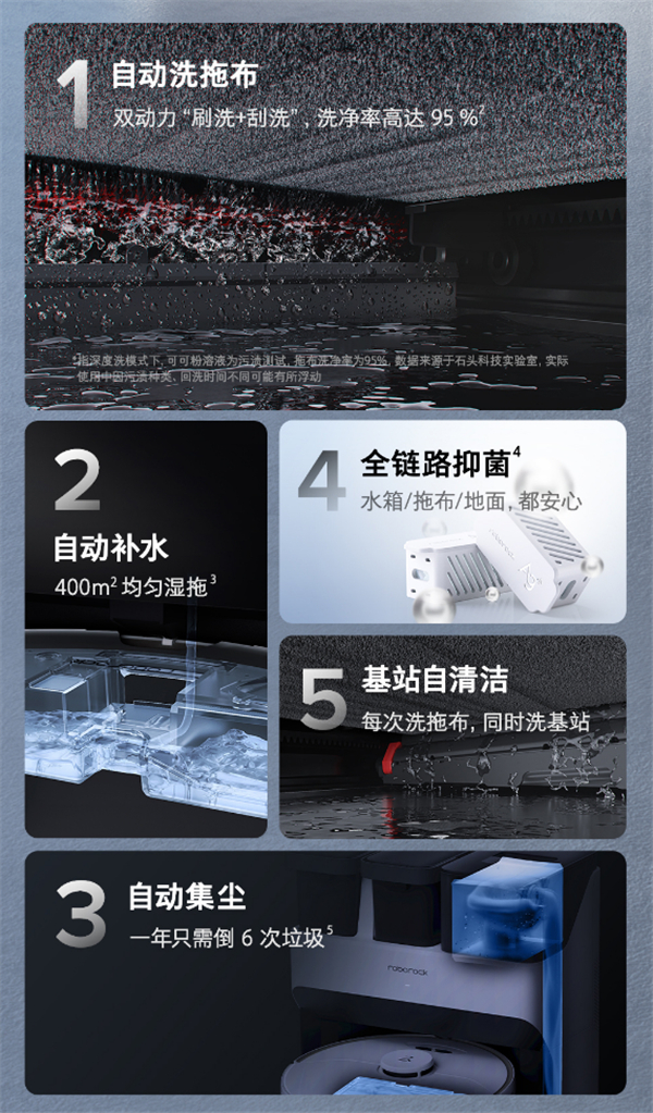 石头自清洁扫拖机器人G10S系列基站全面进化,集成了自动洗拖布、自动集尘、自动补水、自动抑菌、基站自清洁五项核心功能,而且极具前瞻性的模块化基站,还可选配自动换水、自动烘干功能。
