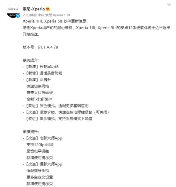 今天上午,索尼官方宣布,开启为Xperia 1III、Xperia 5III开始逐步推送安卓12操作系统,而此次推送更新的系统版本号为61.1.A.4.78。