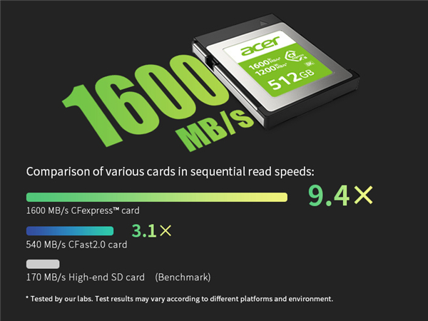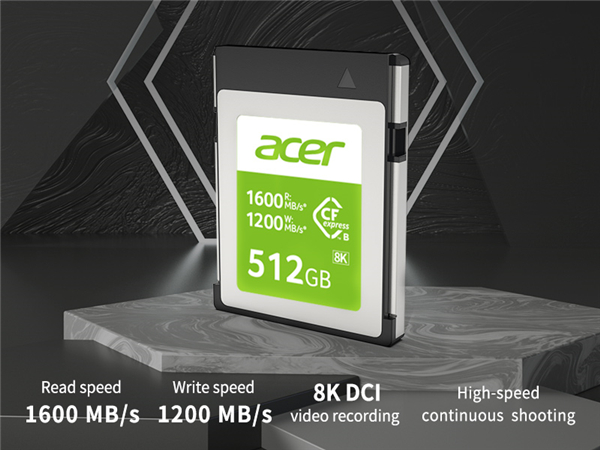 Acer新推出的CFexpress Type B并非Acer自己制造,而生授权给BIWIN存储技术公司,由它设计、制造和销售。该系列存储卡共有128GB、256GB以及512GB三种容量,售价分别是130美元、270美元、460美元,最高读取速度、写入速度分别是1600MB/s、1200MB/s,无论是价格还是容量和市场同类比都没有优势。