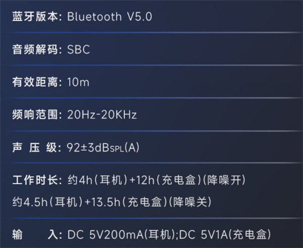 这款耳机支持主动降噪,可达-40dB 混合主动降噪效果,支持环境声监听功能;搭载蓝牙 5.0 芯片,游戏模式下延迟 80ms;开启降噪后,单次续航 4 小时;支持 IP54 级别防尘防水。