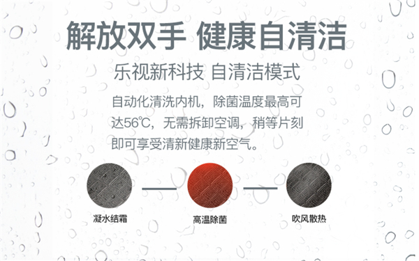 自动清洁功能已经成为空调重要的配置之一,乐视变频空调自动化清洗内机,除菌温度最高可达56度,翅片脏污自动清理,抗菌防霉滤网,强效滤除空气中的浮尘,保持空调清洁状态,高效呵护家人健康。
