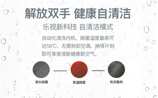 自动清洁功能已经成为空调重要的配置之一,乐视变频空调自动化清洗内机,除菌温度最高可达56度,翅片脏污自动清理,抗菌防霉滤网,强效滤除空气中的浮尘,保持空调清洁状态,高效呵护家人健康。