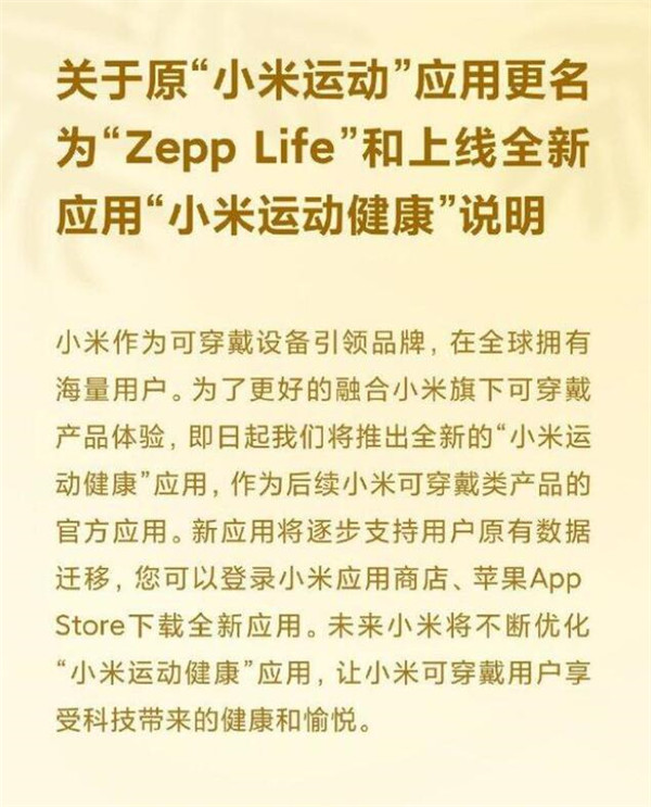 3 月 16 日消息,今日上午,小米官方发布公告称,原“小米运动”应用更名为“Zepp Life”,并上线全新应用“小米运动健康”。