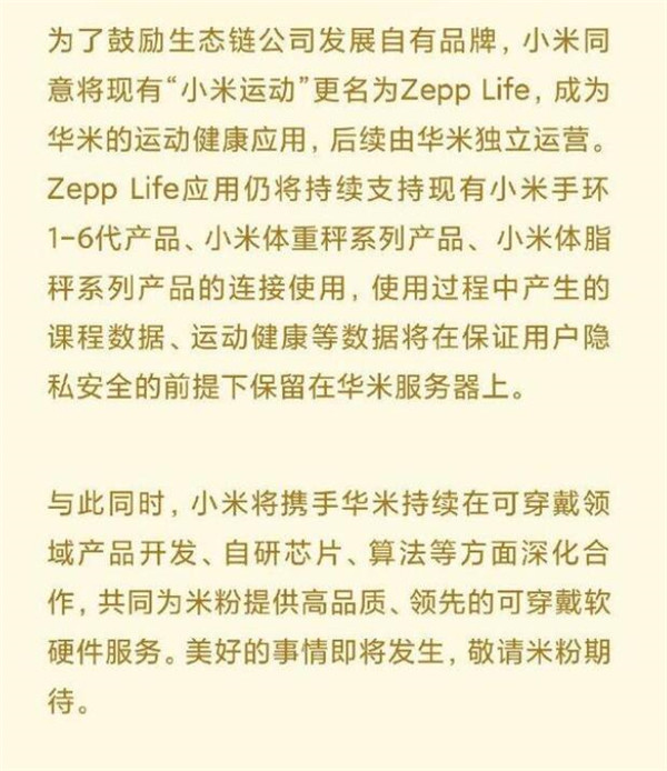 此外,小米称为了鼓励生态链公司发展自有品牌,同意将现有“小米运动”更名为 Zepp Life,成为华米的运动健康应用,后续由华米独立运营。
