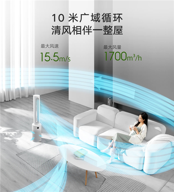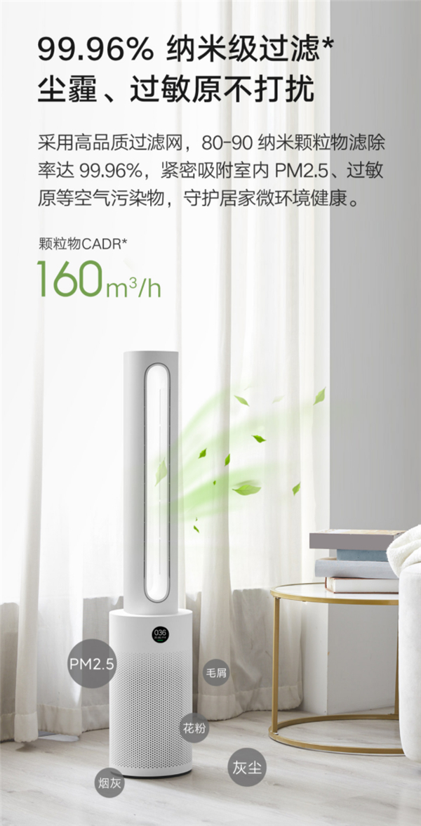 至于过滤能力方面,它则是能支持 99.96% 纳米级过滤,能对尘霾、过敏原进行高品质过滤,颗粒物 CADR 160 立方米每小时,净化能力并不算太强大,不过如果把它当成无叶风扇的“附加功能”,那还算是挺不错的。