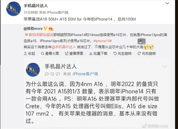 其实,在去年12月@手机晶片达人就曾透露,不是所有的iPhone14系列机型都会升级到A16处理器,iPhone 14将继续沿用 iPhone 13 的A15芯片。