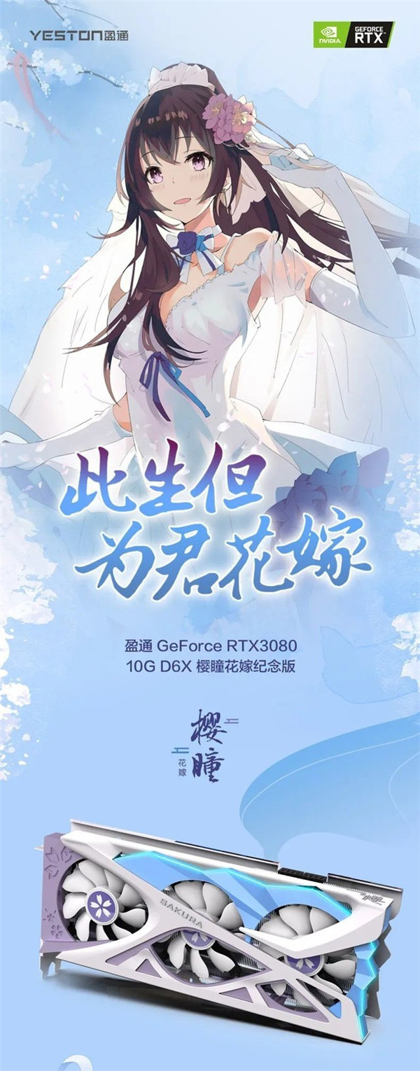 据消息显示,盈通现已发布RTX3080 10G D6X 樱瞳花嫁纪念版显卡,这款显卡的外观采用樱瞳花嫁经典蓝白造型,还配有白色PCB。另外,这款显卡还采用樱瞳灯效设计,具有5色渐变以及同步主板的RGB灯效。而且机身采用CG 原画金属背板,配有白色挡板。