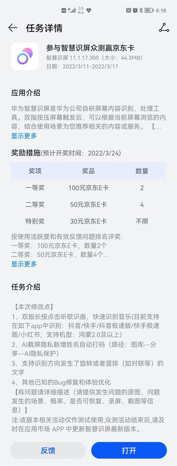 3 月 12 日消息,华为智慧识屏现已开启 11.1.17.300 版本众测,活动时间为 3 月 11 日至 3 月 17 日。