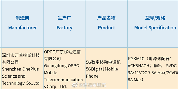 据多位数码博主透露,近日一加旗下的天玑8100新机已经正式入网,应该会在下个月正式发布。认证信息显示,新机型号PGKM10支持150W快充,15分钟能充满4500mAh附送一枚160W快充头。