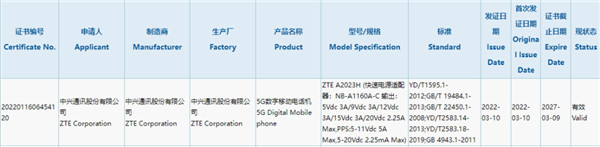 3 月 11 日消息,有网友发现,一款中兴 5G 新机刚通过了国家 3C 质量认证,型号为 ZTE A2023H,标配 NB-A1160A-C 充电器,支持最高 55W 快充。目前还无法确认该机属于哪个品牌或哪个系列。