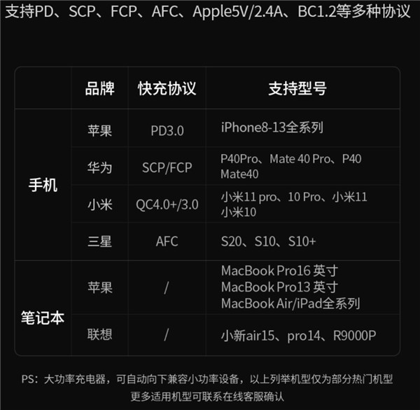 包括支持给苹果 iPhone8-iPhone13 全系列机型快充,也支持给华为 P40 系列、Mate40 系列、小米 11 系列、10 系列、三星 S20、S10 系列等等机型快充。