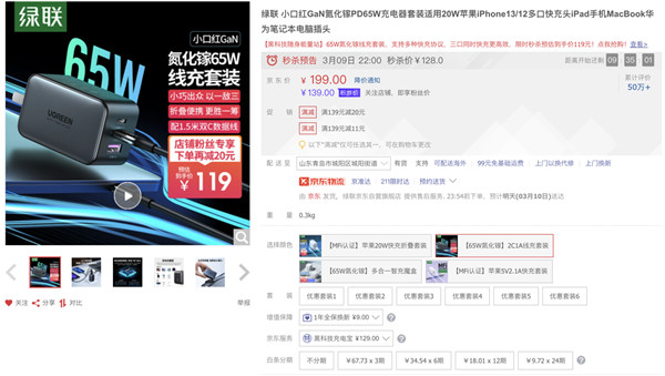 或许是为了应对新 iPhone 发售,其快充头购买“缺口”,日前,绿联全新的 GaN 氮化镓 PD 65W 多口充电器即将在京东平台开启秒杀活动,秒杀价 119 元,如果你有购买快充头的打算,不妨来看看这款产品。