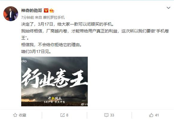 3 月 9 日消息,摩托罗拉官方今日宣布,某款手机将于 3 月 17 日开售,slogan 为“一机超神,等你开新到底!”