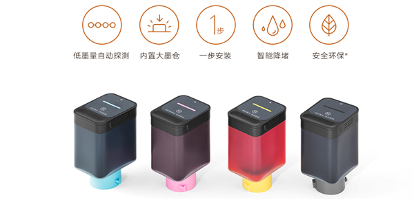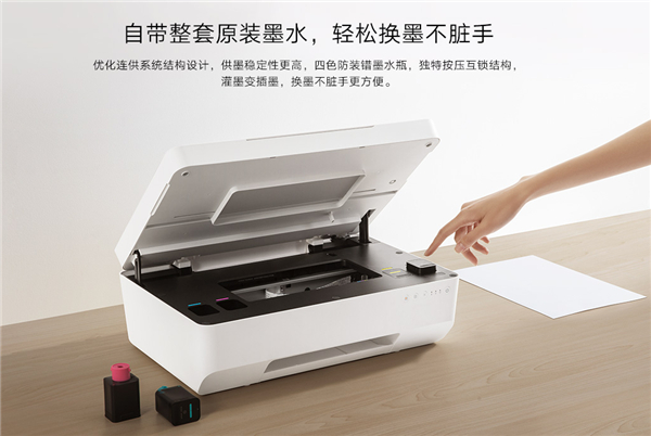 采用优质原装四色燃料墨水,色彩更真实,墨水瓶采用隐性警示灯设计,低墨量下自动提示。