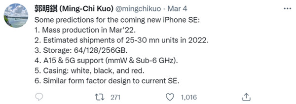 上周,郭明錤还通过 Twitter 表示,新款 iPhone SE 3 将在 3 月 22 日发货,预计 2022 年的销量为 2500 万到 3000 万台。