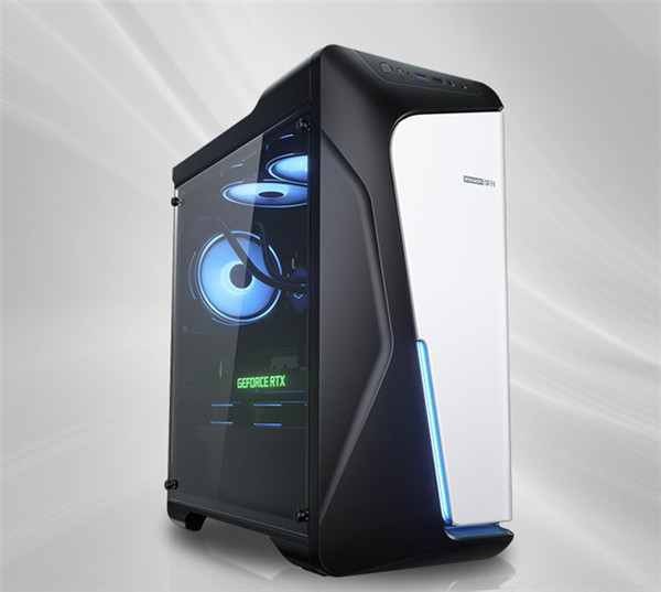 全新升级的攀升战境 S6 酷睿版采用黑白搭配的熊猫配色,在正面的提供了淡蓝色灯带,彰显玩家信仰。整个机箱采用中塔机箱设计,前后提供共计 8 个 USB 接口,并提供多达 8 个 12 厘米风扇位,分别位于前部、后部、顶部、电源仓,方便玩家进行个性化的风扇选择。另外还提供 2 个 3.5 英寸硬盘为和 2 个 2.5 英寸硬盘位,可更好的进行数据扩展。