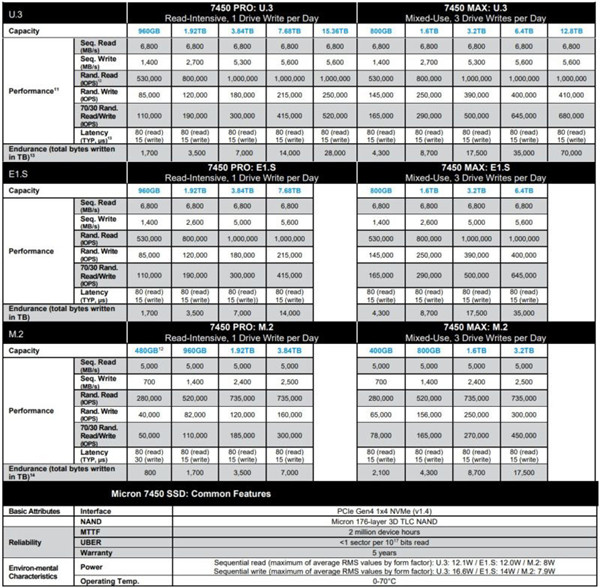 美光 7450 SSD 有两个产品系列:Micron 7450 PRO SSD、Micron 7450 MAX SSD。容量从 400GB 到 15.36TB 不等,外形尺寸包括 U.3(7mm / 15mm)、E1.S(5.9mm / 15mm / 25mm)和 M.2(2280/22110)。