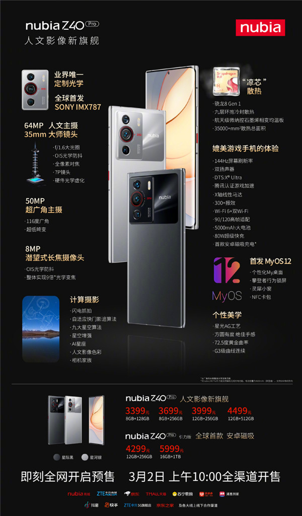 3 月 2 日消息,今年 2 月底,努比亚 Z40 Pro 人文影像新旗舰手机发布,售价 3399 元起。今天上午这款手机已正式现货开售。